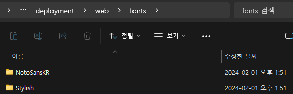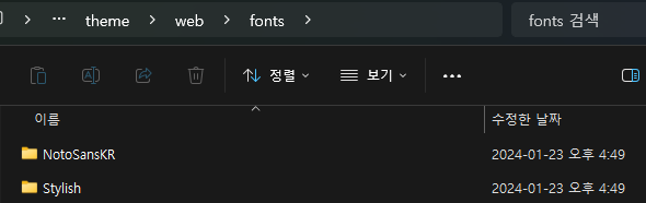 프로젝트 App 디렉토리 > theme > web > fonts 폴더 아래에 생성한 폰트 폴더 및 파일을 옮긴다.